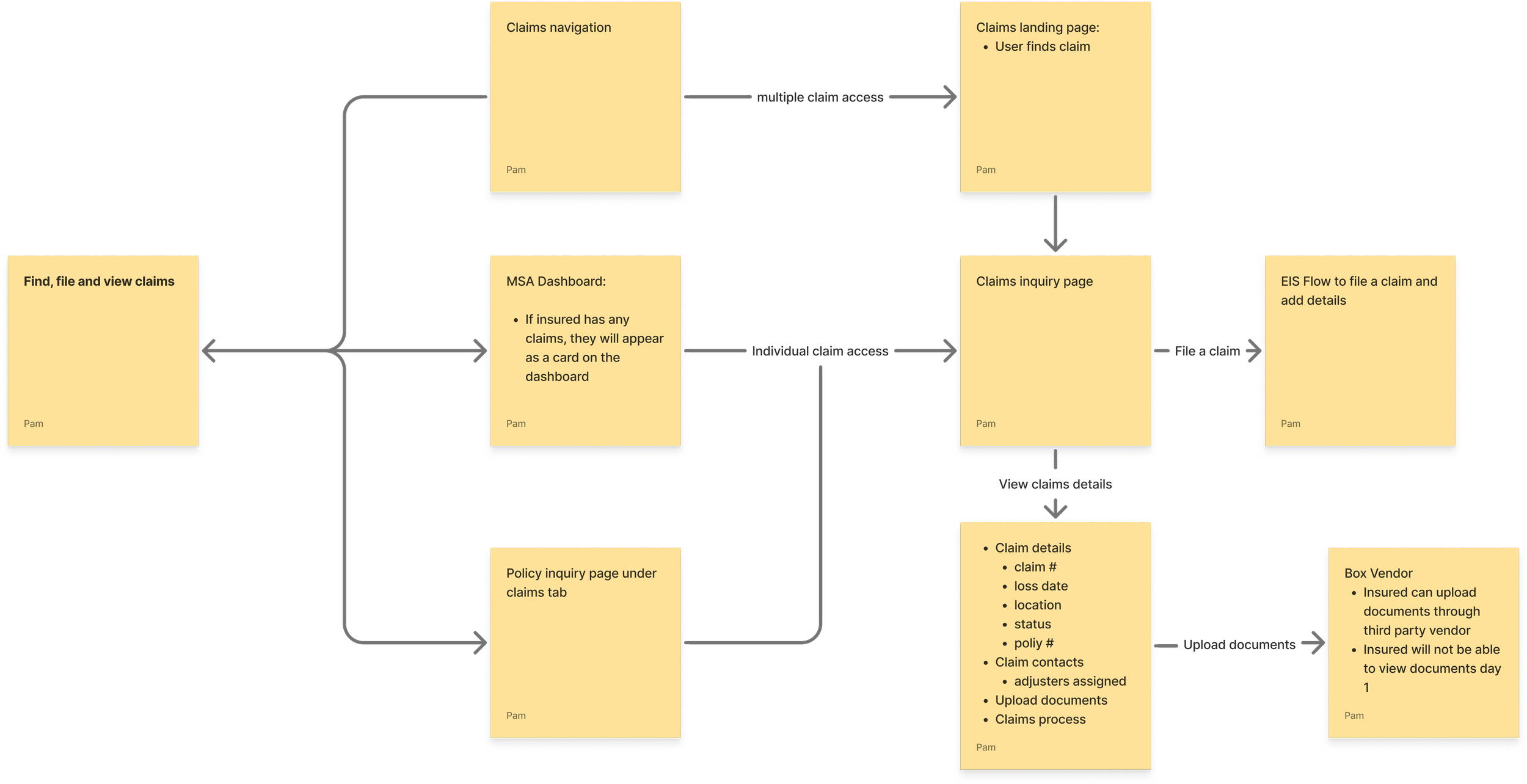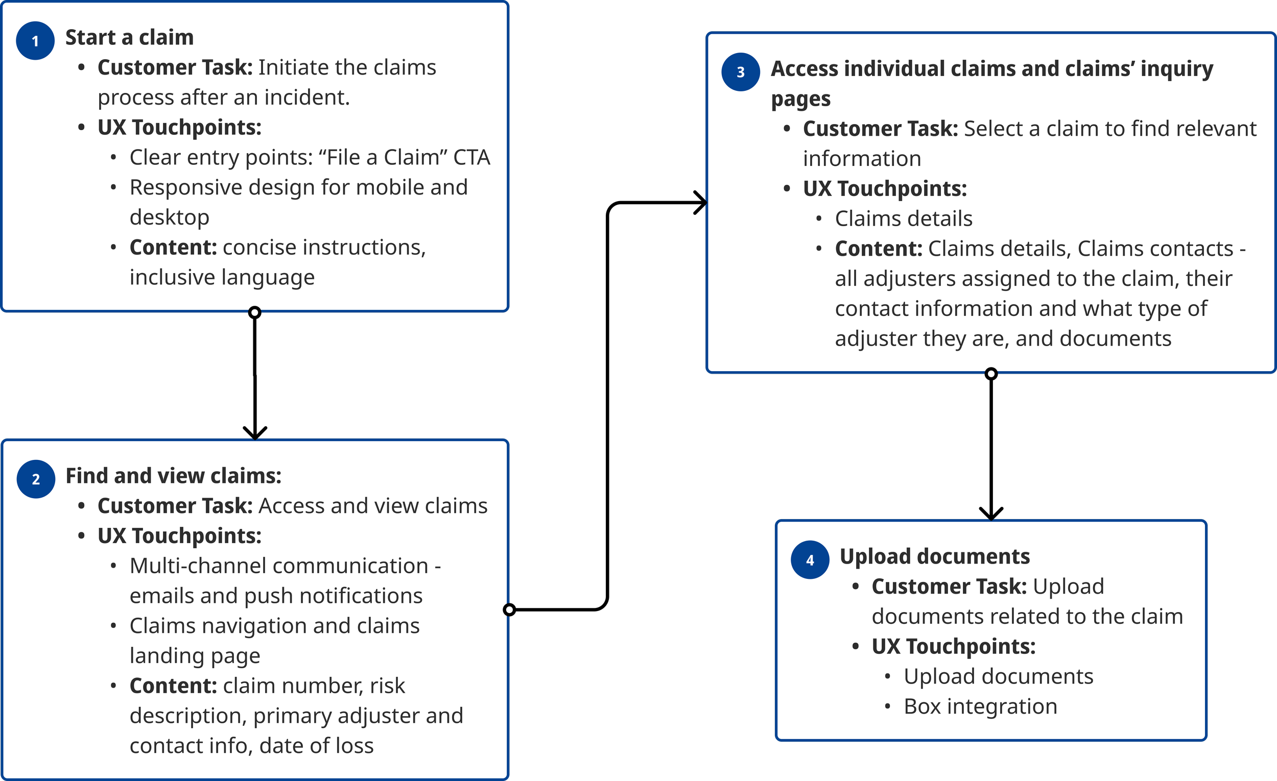 I began by identifying key customer tasks—like filing a claim or uploading documents—and mapping out the journey to ensure each step is intuitive and accessible.