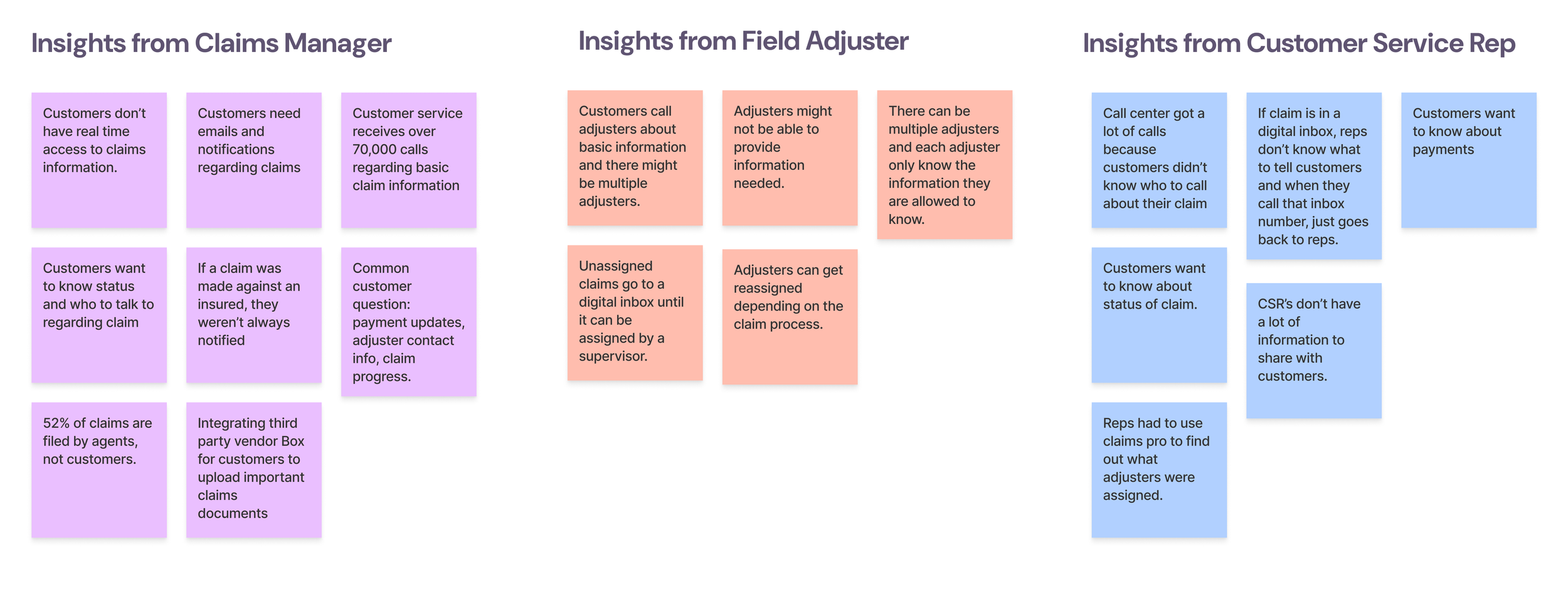 Stakeholder interviews across claims adjusters, claims management, and customer service revealed the following themes: