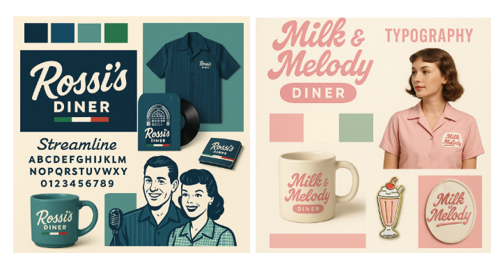 I started with what Anthony gave us — the personality of each diner, the 1950s retro feel he wanted — and explored color and typography directions that could carry that personality while staying accessible. Every color choice had to meet WCAG AA contrast requirements, especially on large-format screens where lighting conditions aren't always predictable.