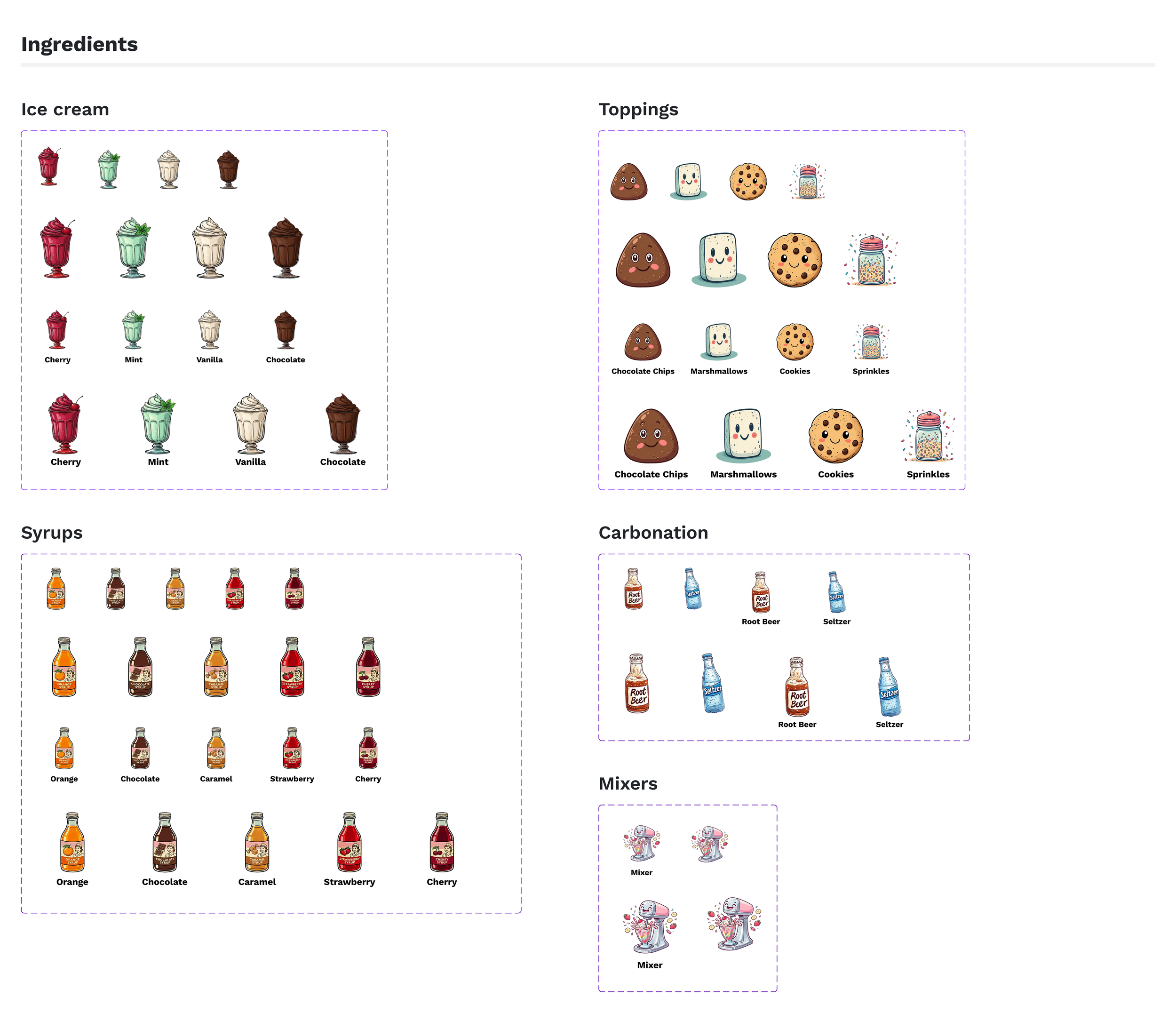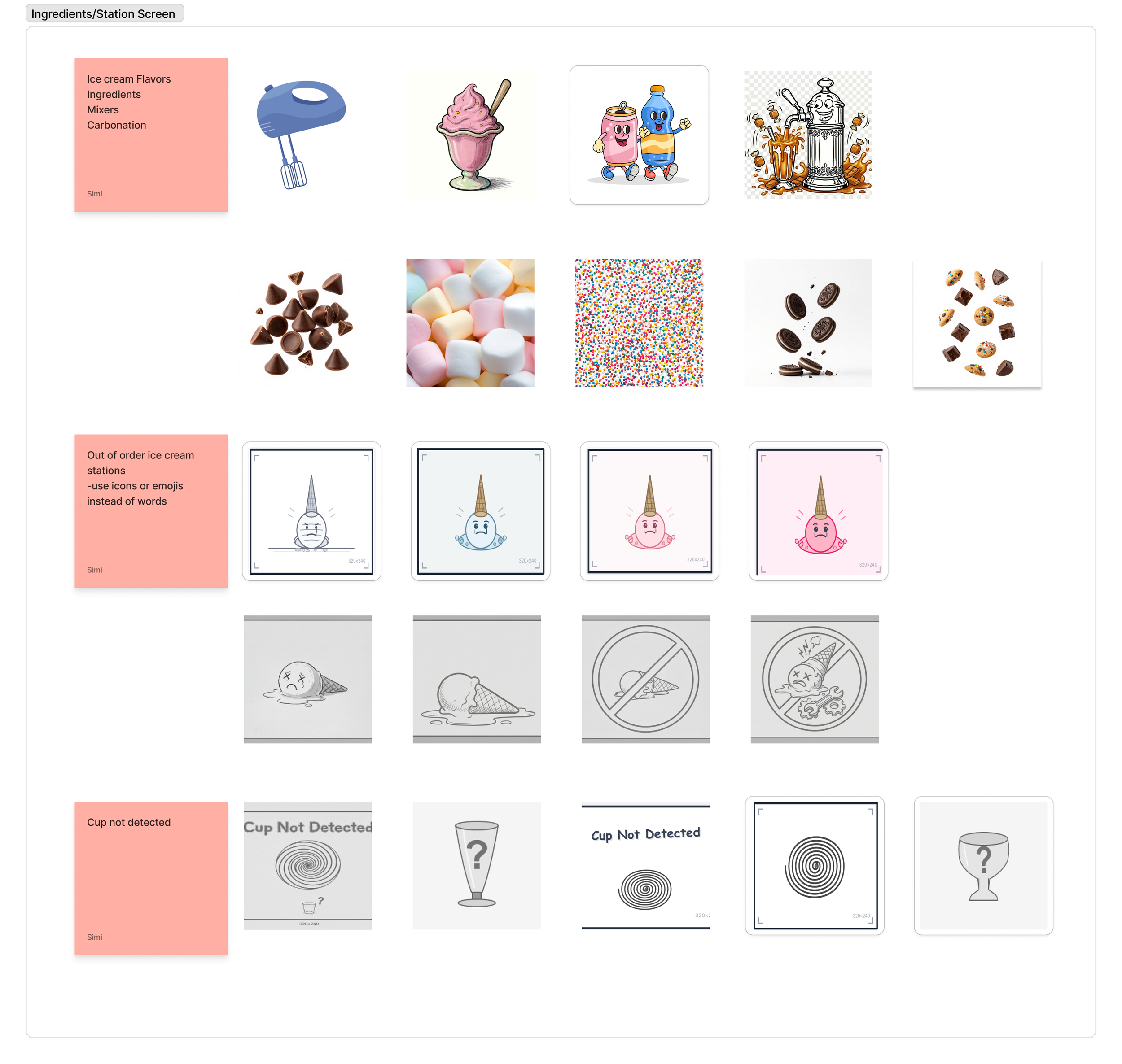 Station Screens: Icon explorations for the station screen covering ingredient categories, error states, and cup detection. Designs by Simi Kohad.