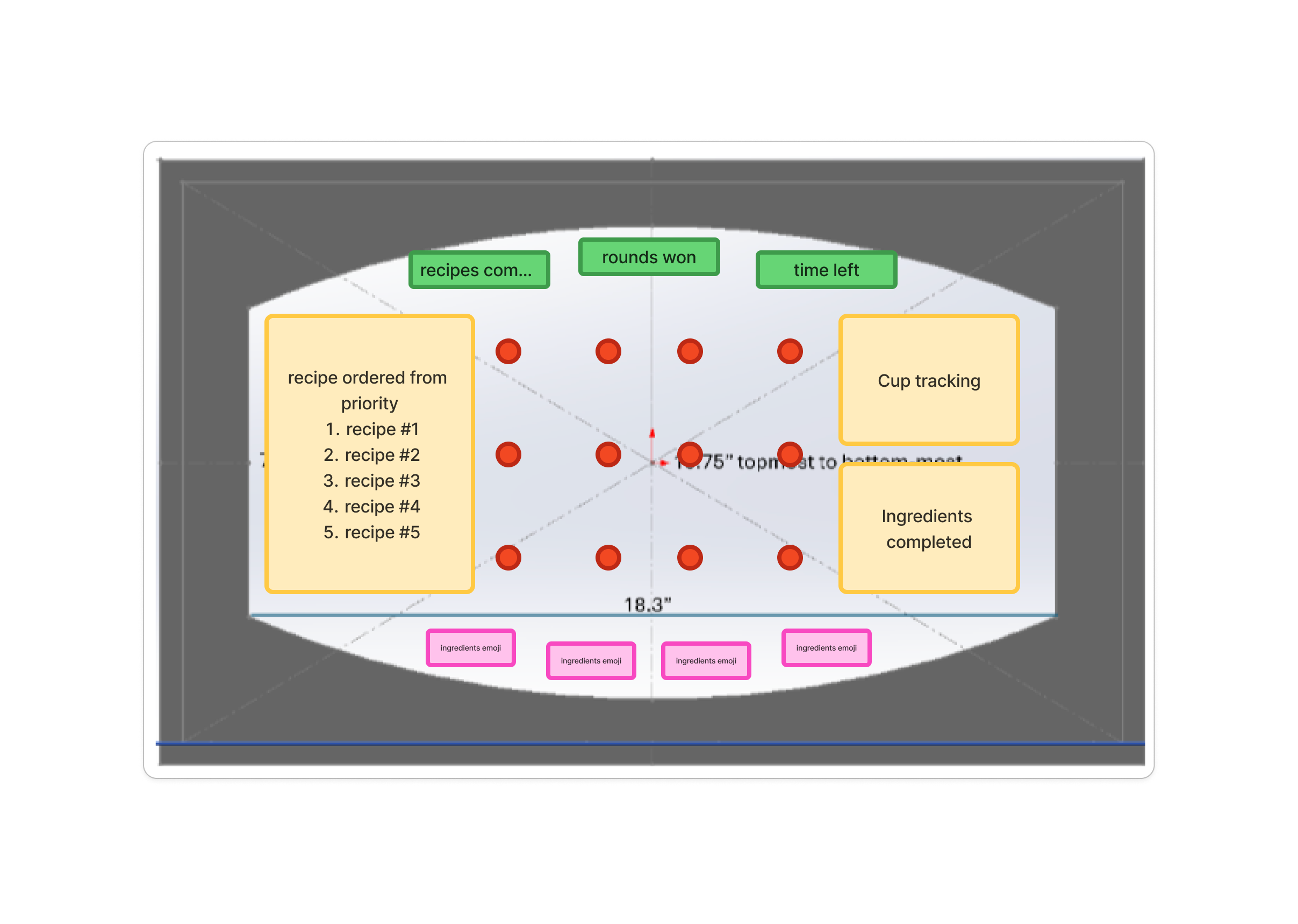 Solo player screen: Early layout exploration showing recipe priority queue, cup tracking, and completed ingredients. Design by Zoe Chang.