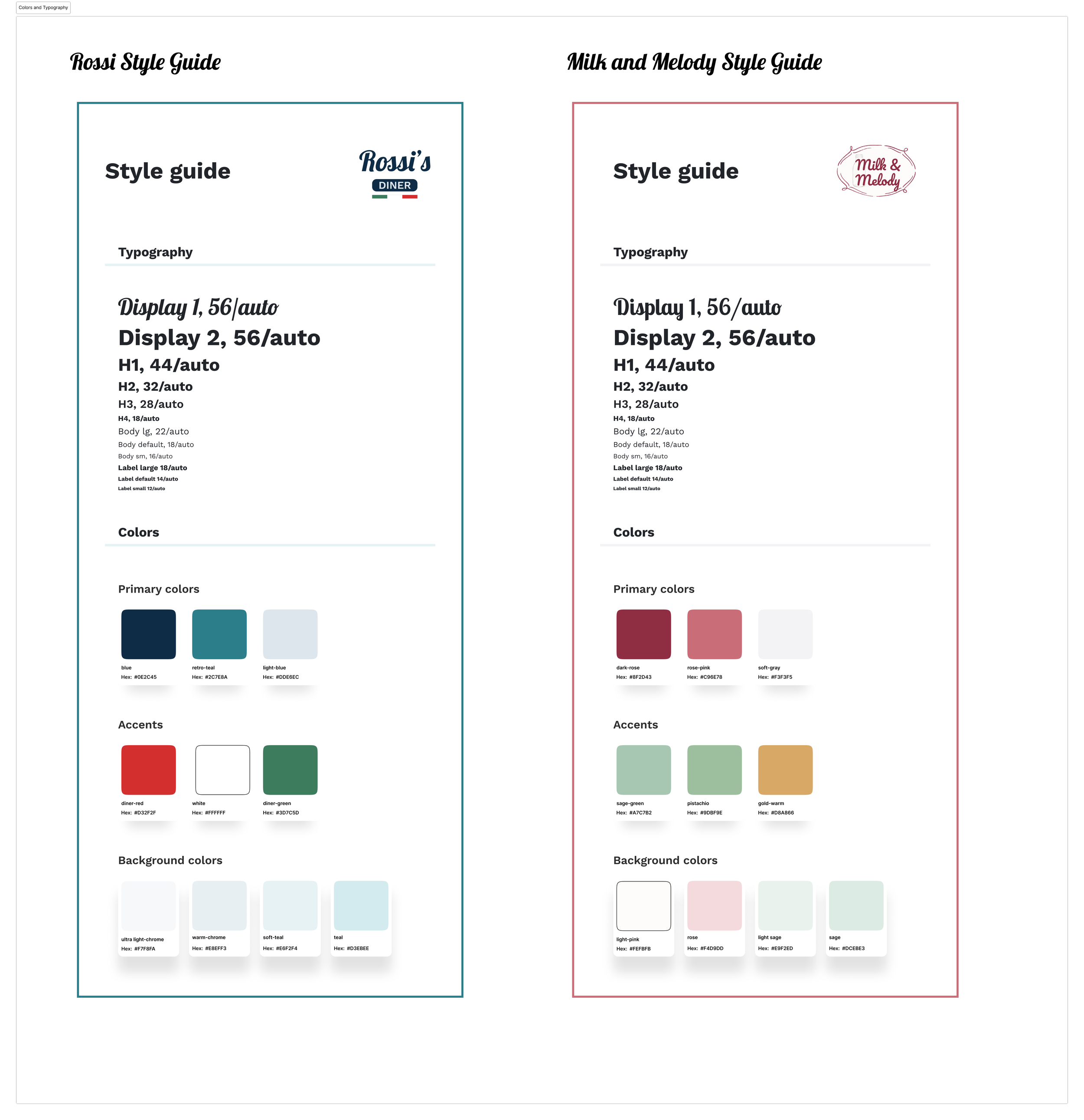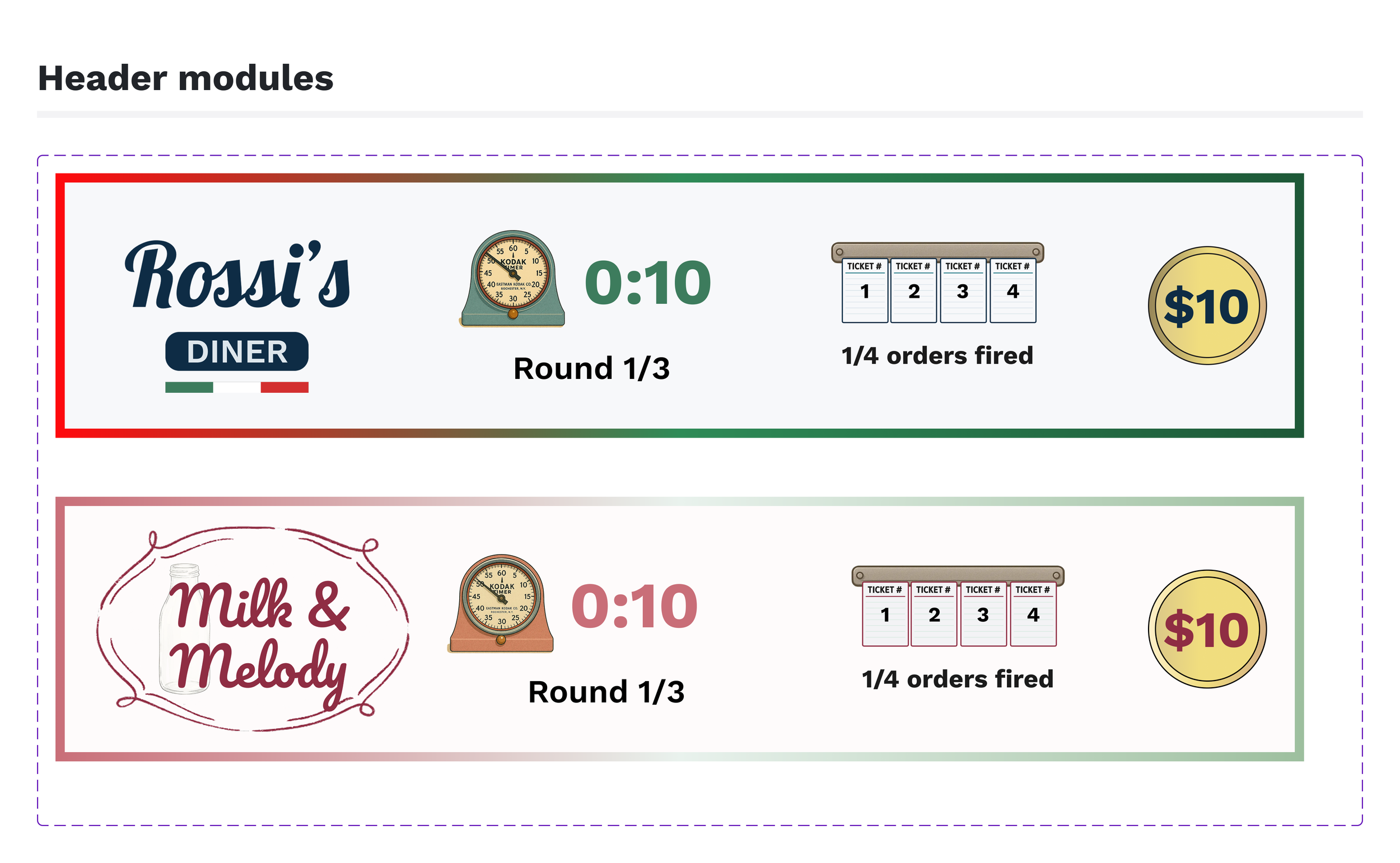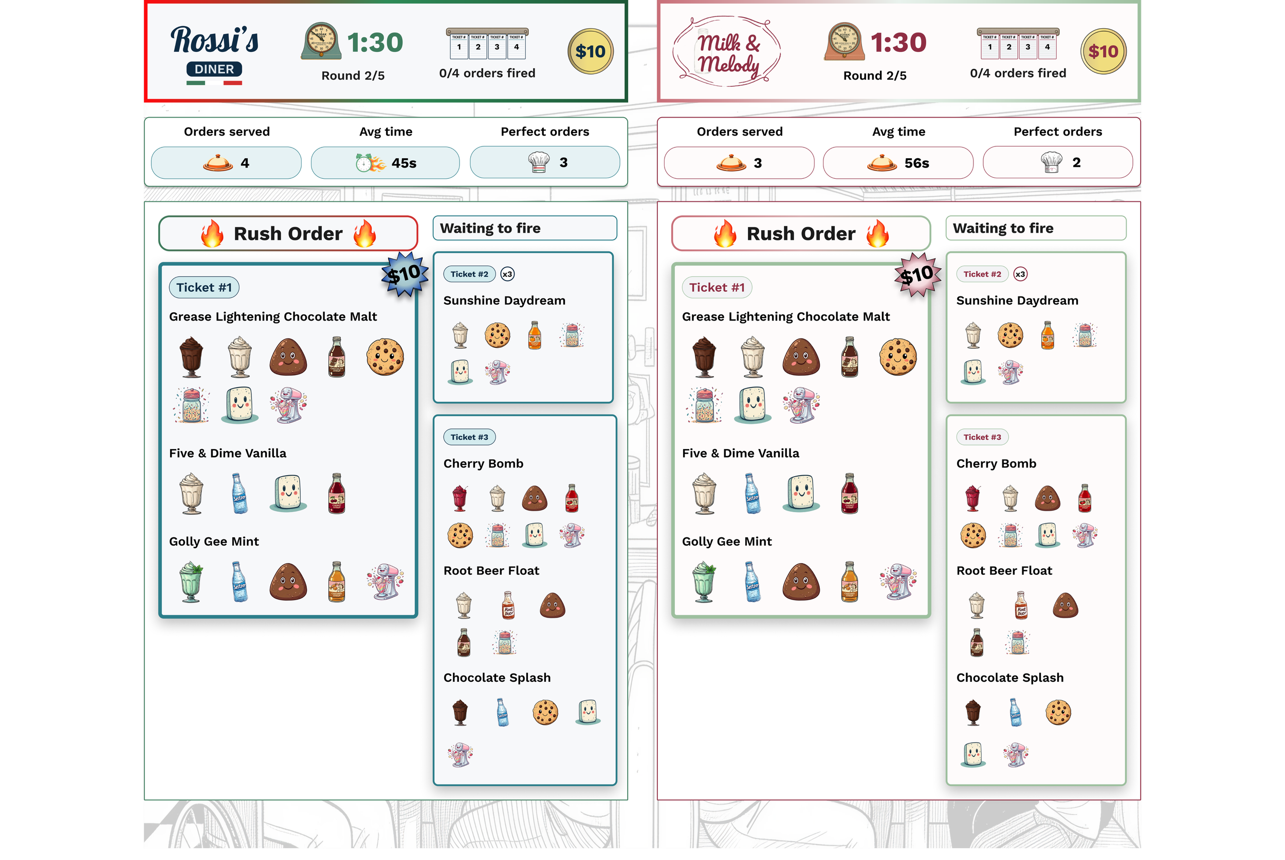 Anthony had a full backstory for each diner — Rossi's Family Diner and Milk & Melody weren't just team names, they were characters. I needed to translate that into two visual identities that felt distinct on their own screens but still read as one cohesive game when the two 60" displays sat side by side.