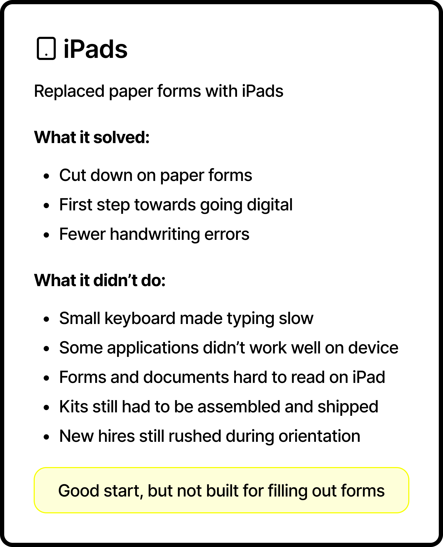 The first fix was iPads. We handed new hires iPads to fill out forms during orientation. It cut down on paper, but typing on a small keyboard was slow, and some applications didn't work well on the device.