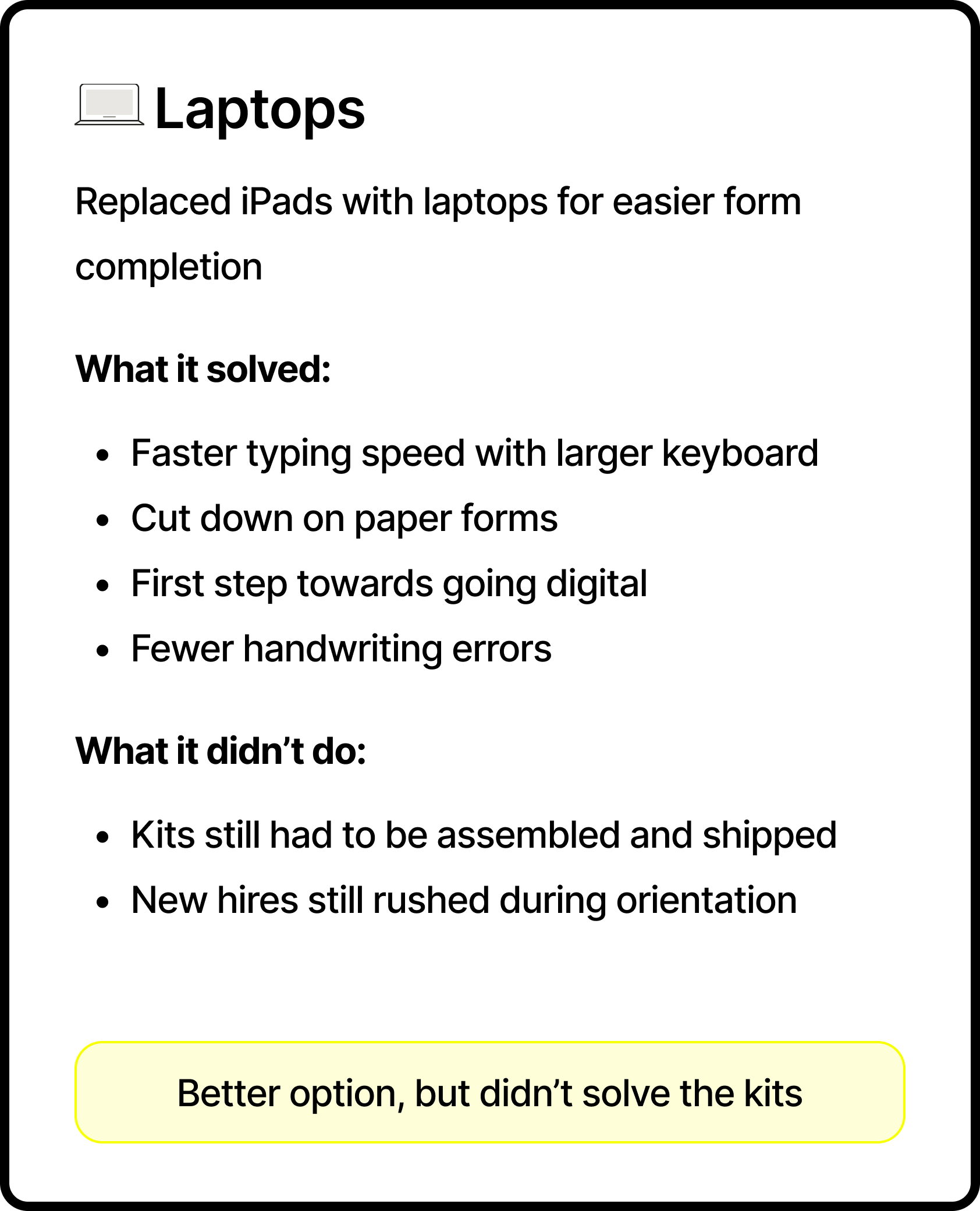 Laptops worked better. New hires could type their forms and submit them electronically. Fewer handwriting errors, cleaner data going into the HRIS. But the kits still had to be assembled and shipped, and new hires still felt rushed getting everything done during orientation.