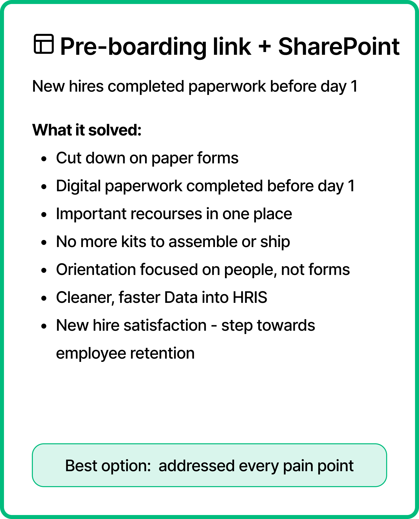 Orientation went from paperwork to people. Instead of 2.5 hours filling out forms, new hires could spend their first morning with their teams. I still sent follow-up emails for any outstanding items and offered one-on-one benefits walkthroughs for anyone who wanted them.