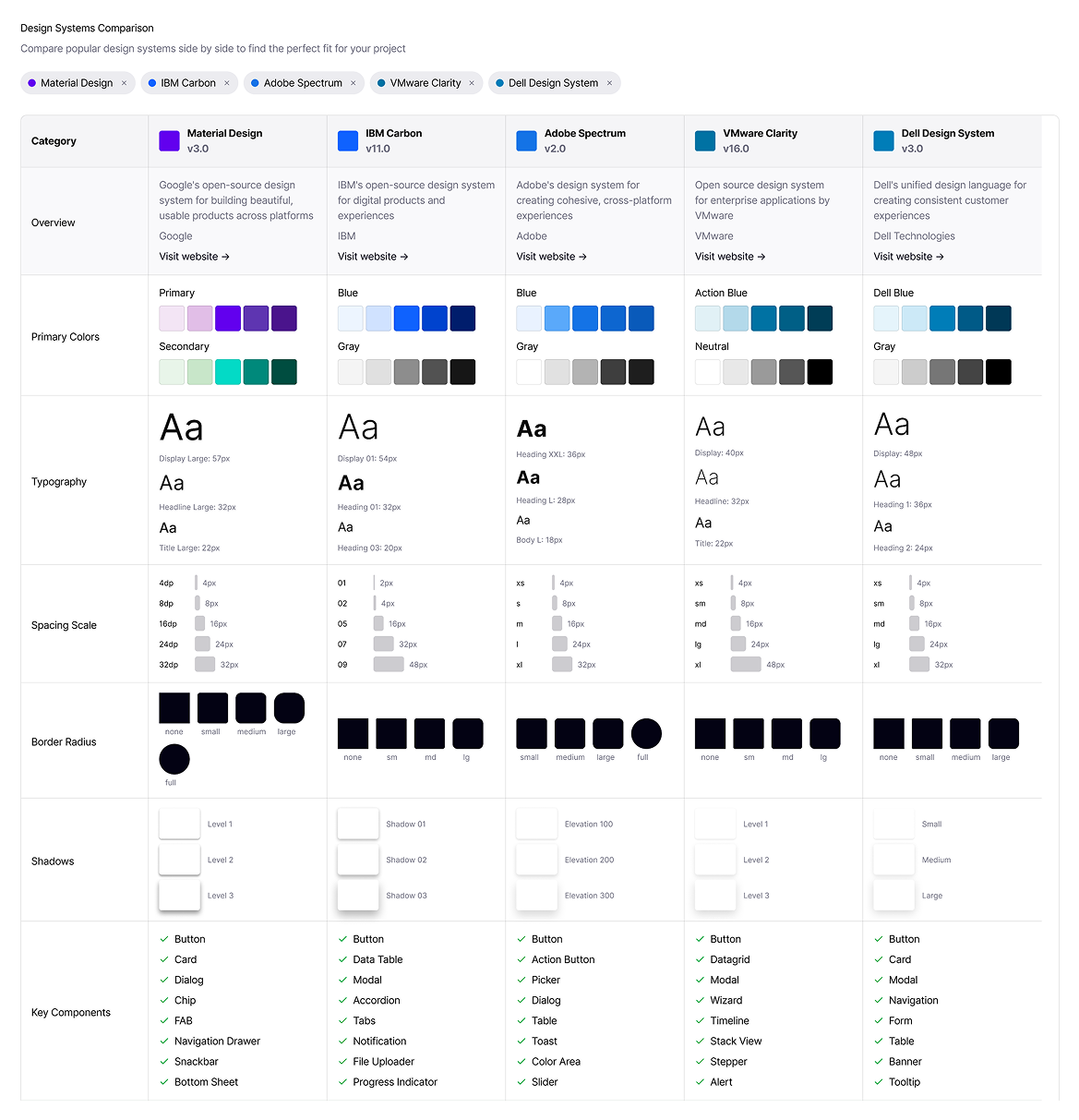 Adobe Spectrum: Accessibility‑first approach with robust token architecture.
