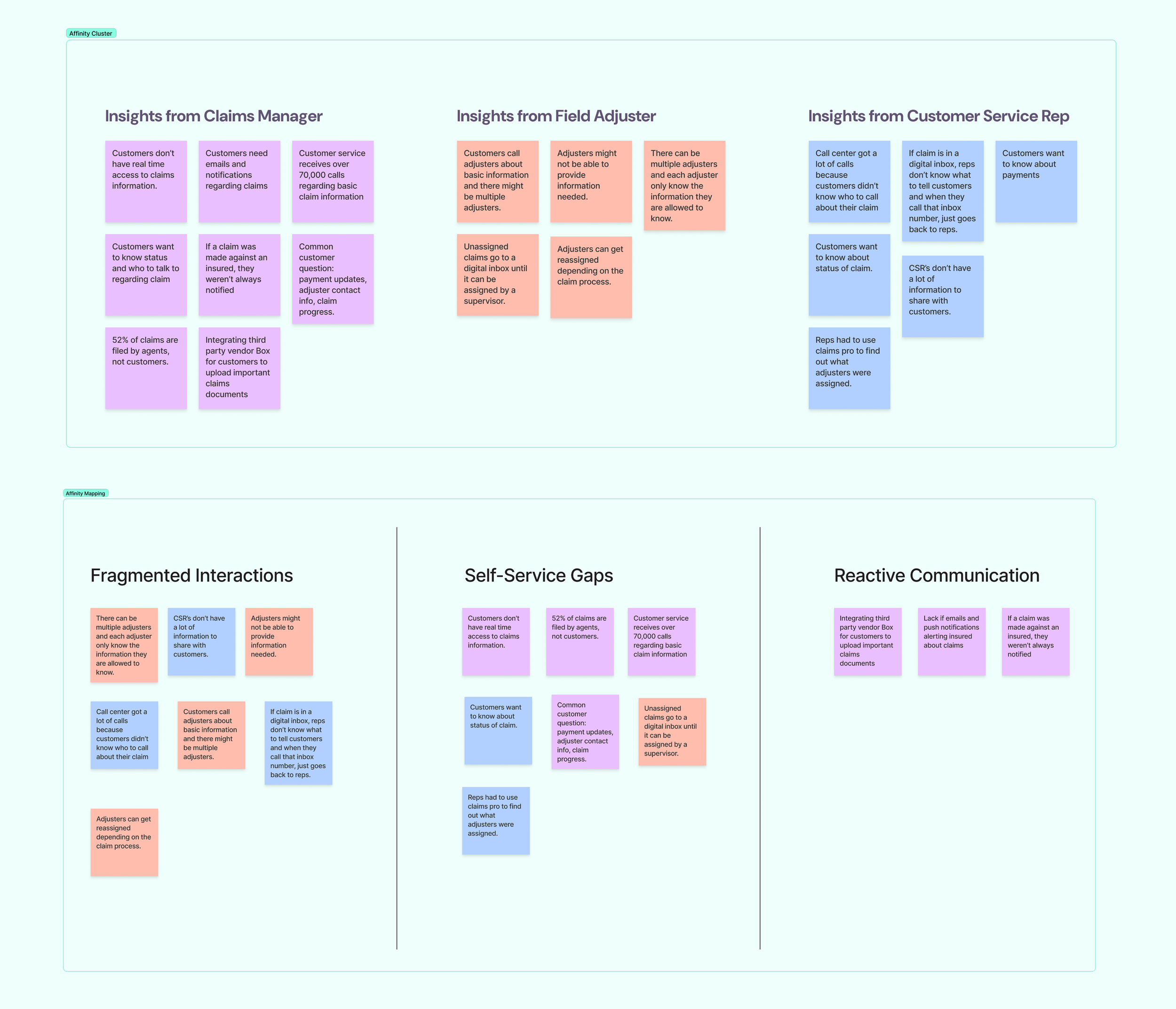 Affinity clustering from 6-8 stakeholder interviews with claims adjusters, claims management, and customer service.